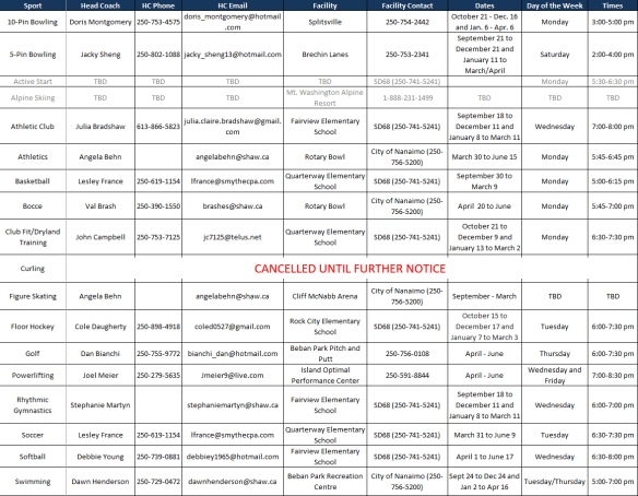 Fall 2019 Nanaimo SO schedule